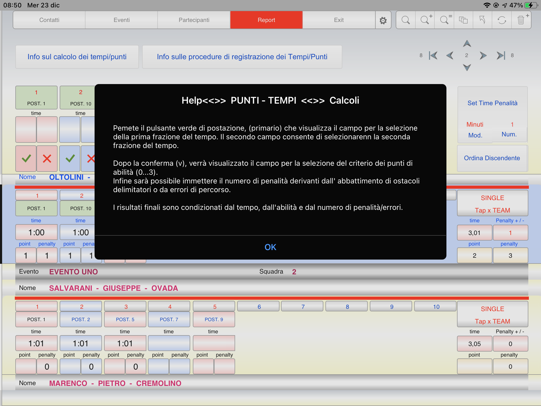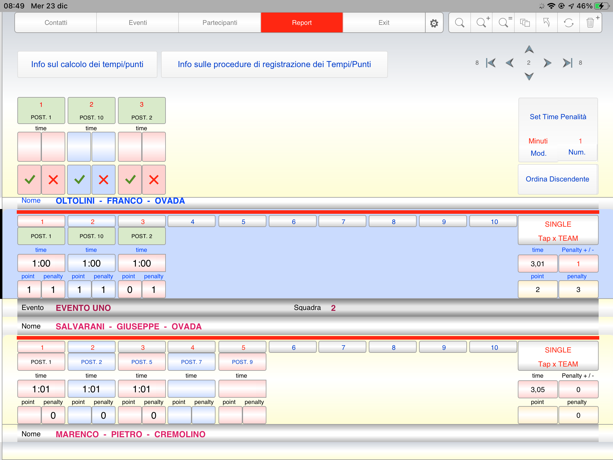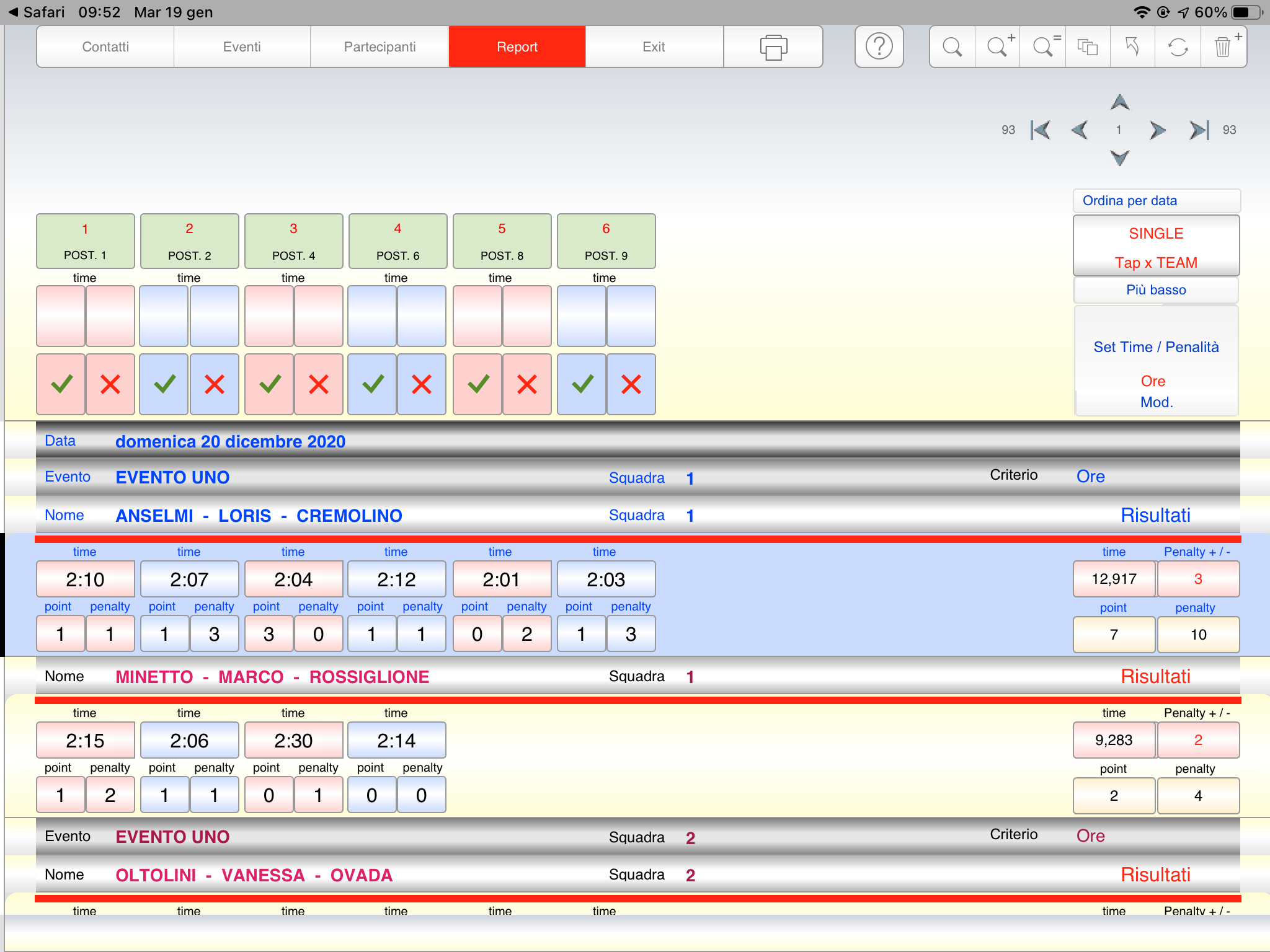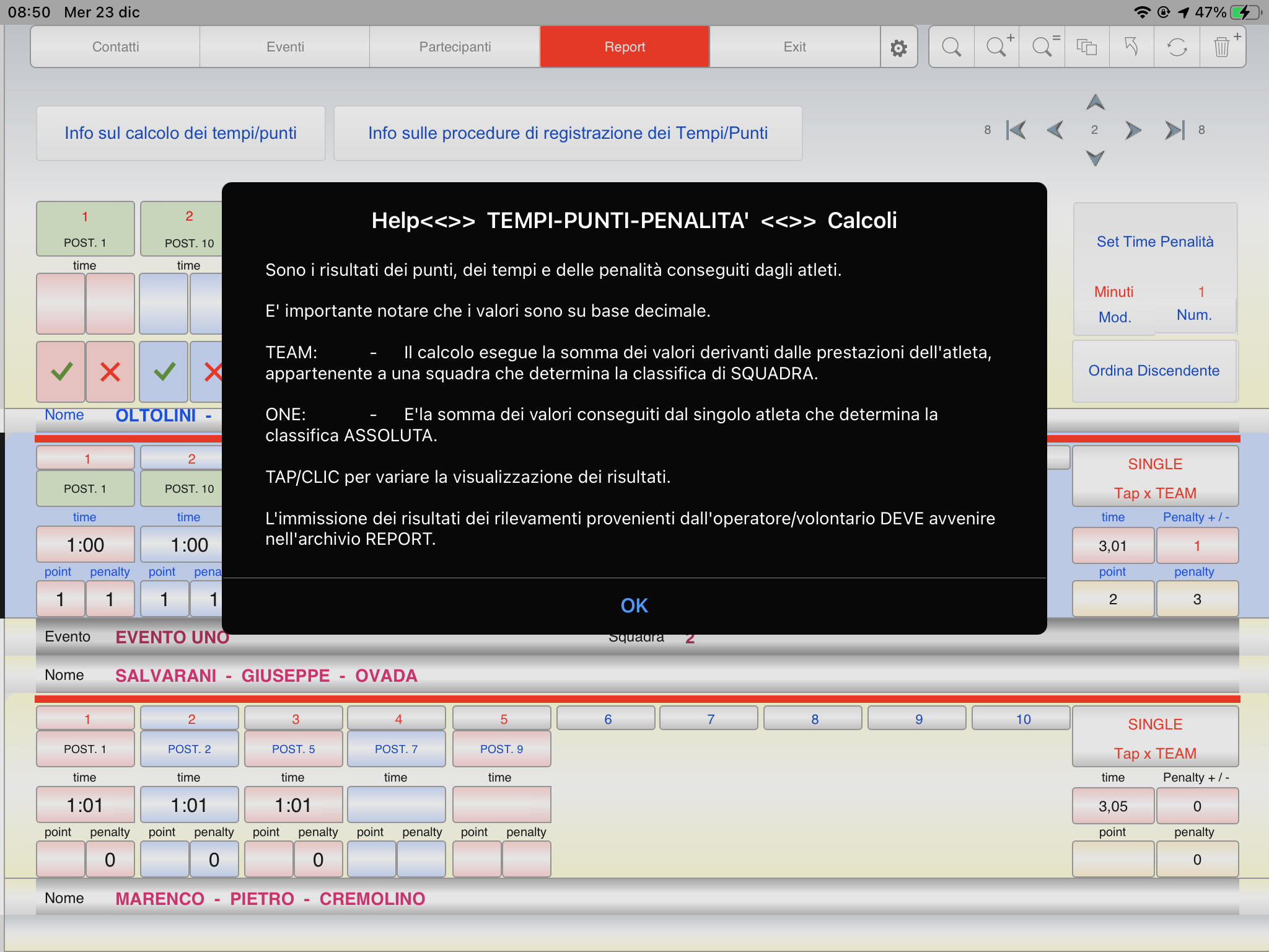 Al termine della manifestazione, le rilevazioni "manuali", verranno registrate dall'amministratore nell'archivio Report, nel quale saranno stilate le classifiche considerando i risultati di ogni partecipante in modalità "single " ed eventualmente "team" determinando la "classifica assoluta e/o di squadra".